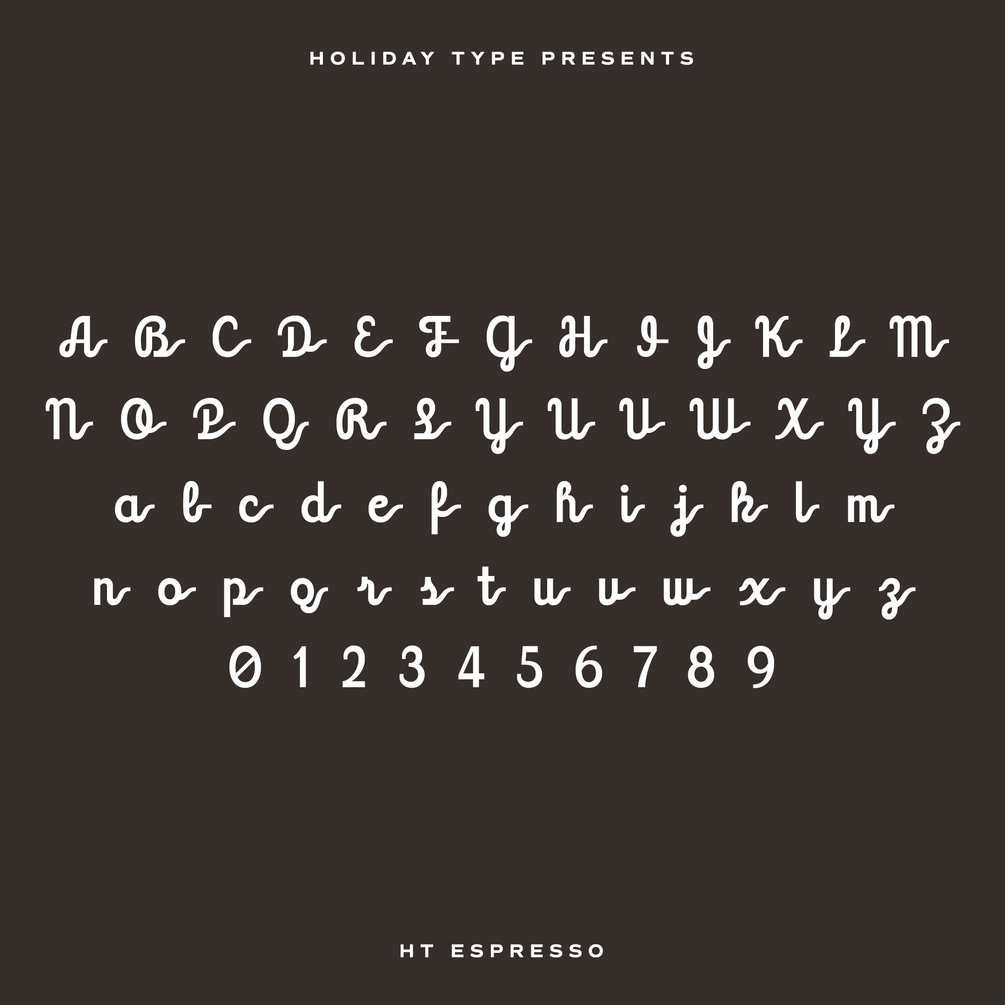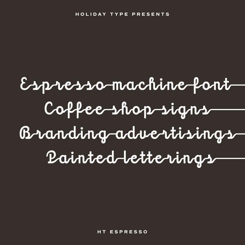 Retro script based on shopfront lettering, wallpaint advertisements in Italy around 1950s. The biggest feature of HT Espresso is a mixture of straight line and curve.It is like a cup of espresso with a bite-sized piece of chocolate. You can connect all the letters with thin line and It would attract notice.