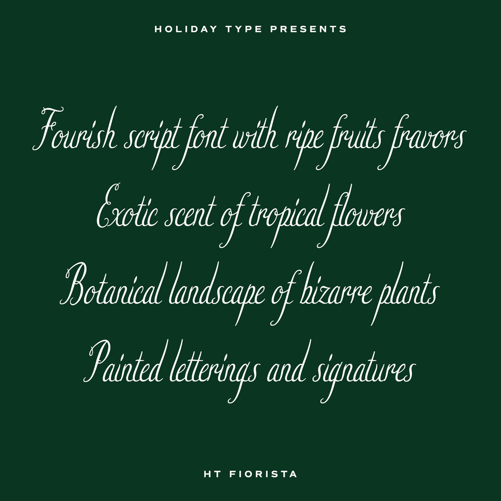 Retro script based on shopfront lettering, wallpaint advertisements in Italy around 1950s. Fiorista is a pretty brush scrip with thin and curly line. Florists works best for greeting card, wedding ceremony invitation or shop card of fashion or apparel. It could also be used for film, magazines, advertising and websites.